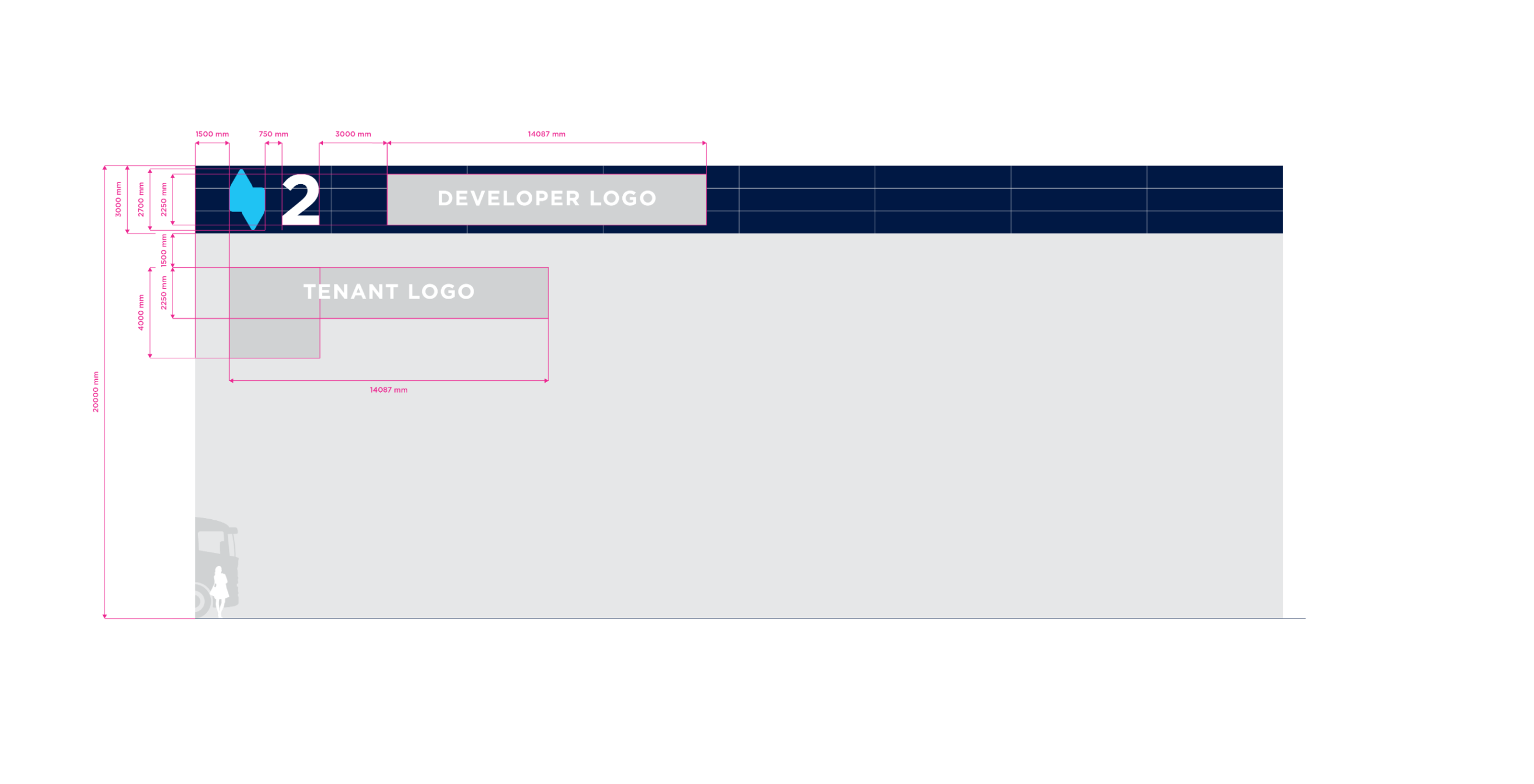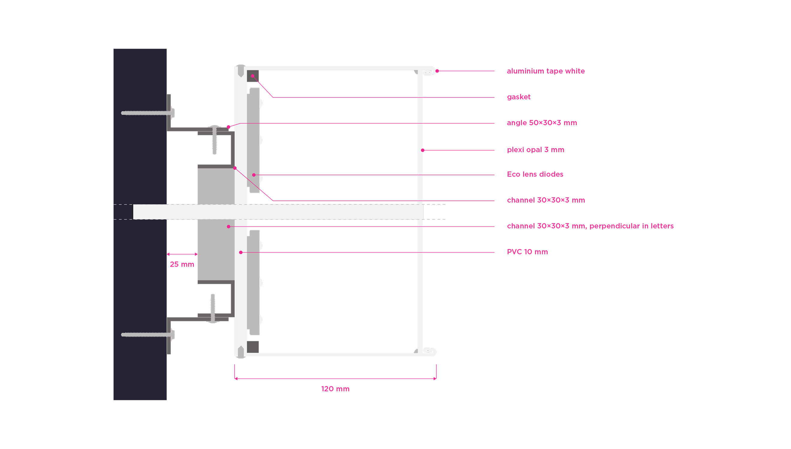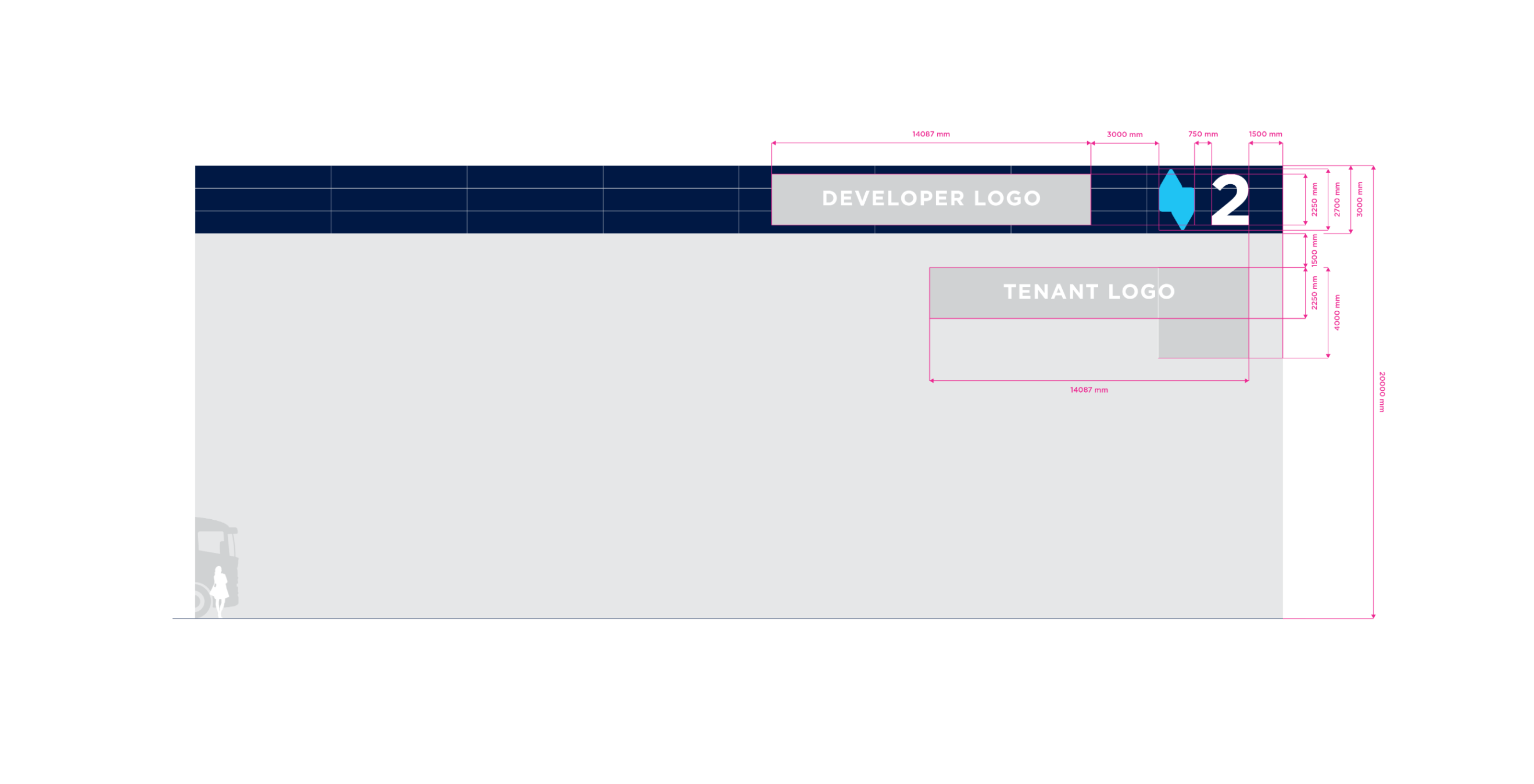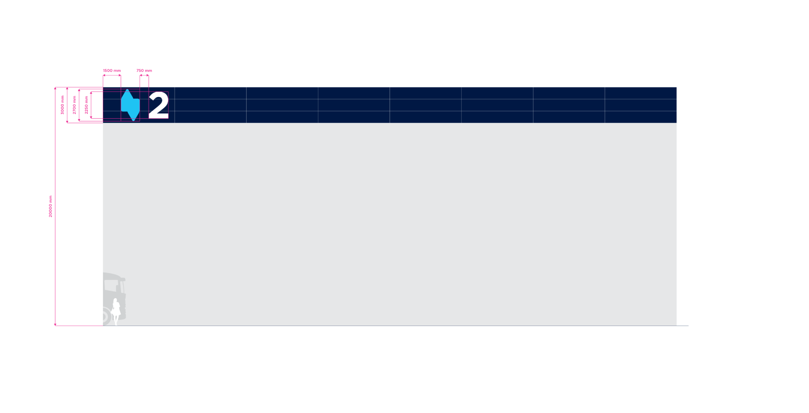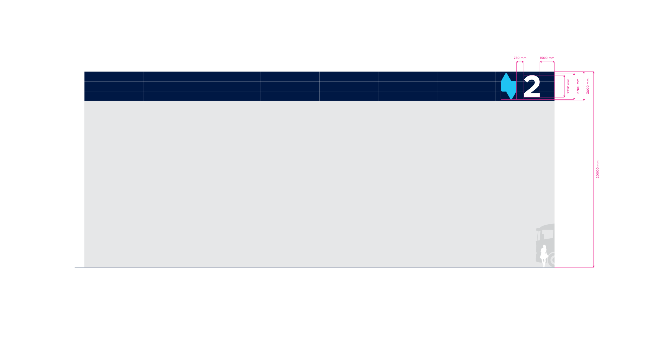 Double Stripe is the standart for stripe facade building type. The height of the building may vary in practice. For the purposes of standardizing branding rules, we specify the size standard as 12 meters and the large size category as 20 meters. Character depth 120 mm. The individual characters are shaped and welded from AL sheet metal and painted with two-component acrylic paint in a RAL shade as agreed. The front surface of the characters is made of opal plexiglass with a translucent film in the required color; the index is without adhesive film. The plexiglass is attached behind a glued inner plexiglass rim. Internal illumination with LED light-emitting diodes. Power transformers are located inside the signs. Individual signs will be mounted directly behind the wall of the building. Power supply 230 V, 50 Hz, TN-S system, required supply min. CYKY3C x 1.5 mm2 10 A/D, power consumption approx. 200 W.